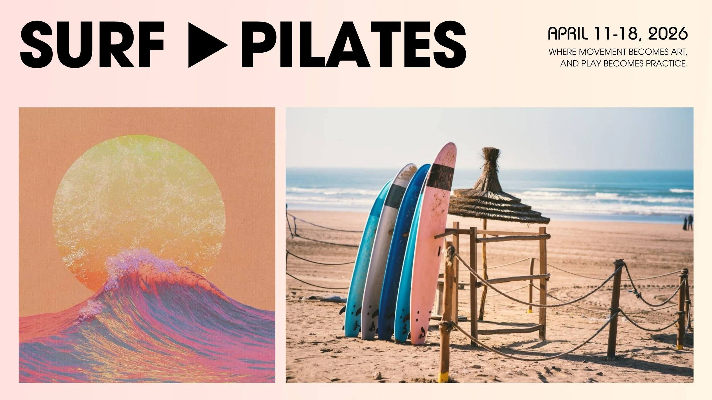This retreat is an invitation to move, play, and create. The Art of Flow isn’t about perfection, it’s about what happens when you stop trying to control the moment and start letting it move you. Read aloud, it’s surf play pilates because that’s what we’re doing here: moving our bodies, making a little magic, and remembering how f*ing good it feels to let go and surrender.